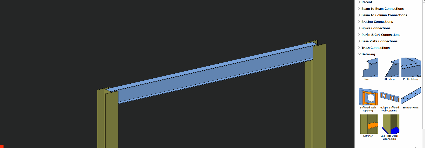 In ProtaSteel, "Stiffened Web Opening Macro" create an opening on the web of the profile. Placing the mouse cursor over the "Stiffened Web Opening Macro" under "Detailing" section in Macro Gallery will reveal the tooltip describing the scope and steps of this macro.