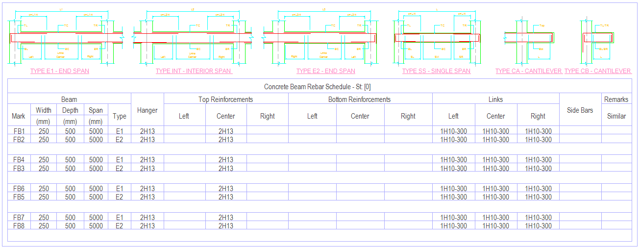 The explanation and detail are similar to Storey Beam Elevation Drawings. Please refer to article : Storey Beam Elevation Drawings for more details. Beam Rebar Schedule