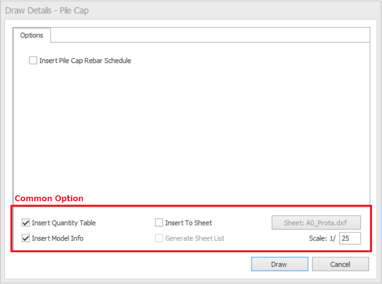 - Common Options : These setting can be found in all "Draw Details" dialogue. The common options allow to insert Sheet (Title block), quantity table, model info and adjust scale of drawing.