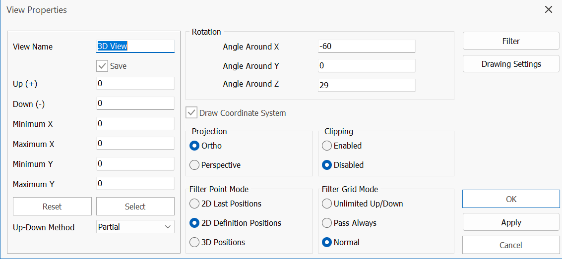 - Up-Down Method: Sets the visibility of objects. This option works the same as in model views. If "Full" is selected only the objects which are fully in the described region are displayed, whereas if "Partial" is selected, elements which are partially in the described region are also displayed.