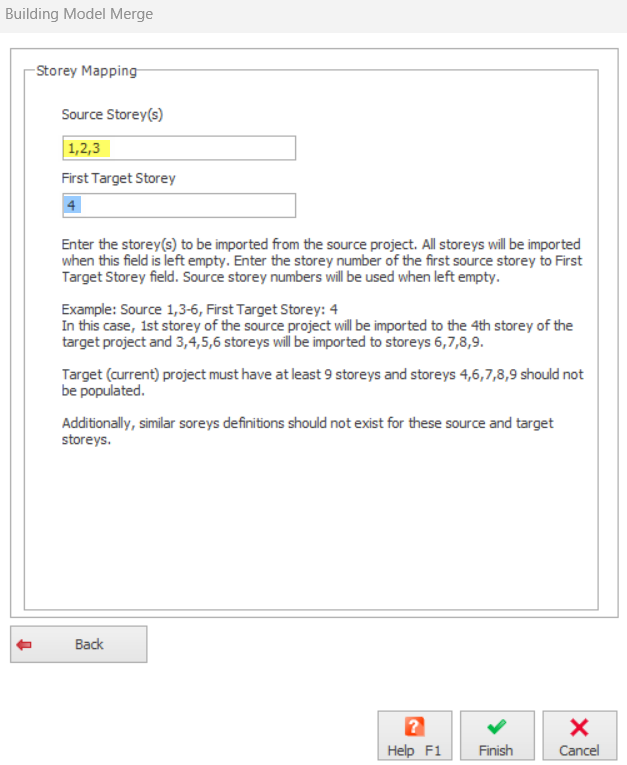 - Under "Source Storey(s)" insert the storey(s) desired to be merged from the loaded model in the manner shown below or following the example description. Then, enter the first target storey and click on "Finish". The storeys will then be added automatically into your model with respect to the columns' axes of intersection. Please ensure that columns from the source storey and target storeys have the same axes of intersection.
