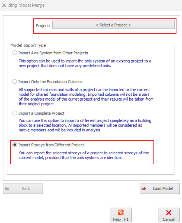 - In "Merge Building Model" tab, select a model project. Then, check "Import Storeys from Different Project" option and click "Load Model".