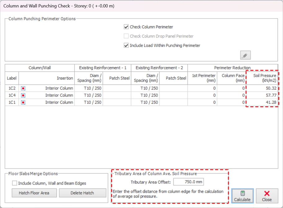 Adjust the settings here if necessary. For other parameters and settings in this dialog, please refer to Column Punching Check. - Please enter the value of Tributary Area offset in the input field and the soil pressure will be automatic detected.