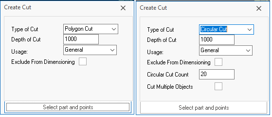 - Type of Cut : User may choose to have a "Polygon Cut" or a "Circular Cut". (Cut example shows when curve hover over the icon.)
