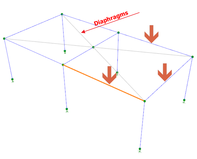 - The slab rigid diaphragm (grey lines) is created in the same floor plane and will constrain all the beams including the “lowered” beams as expected.