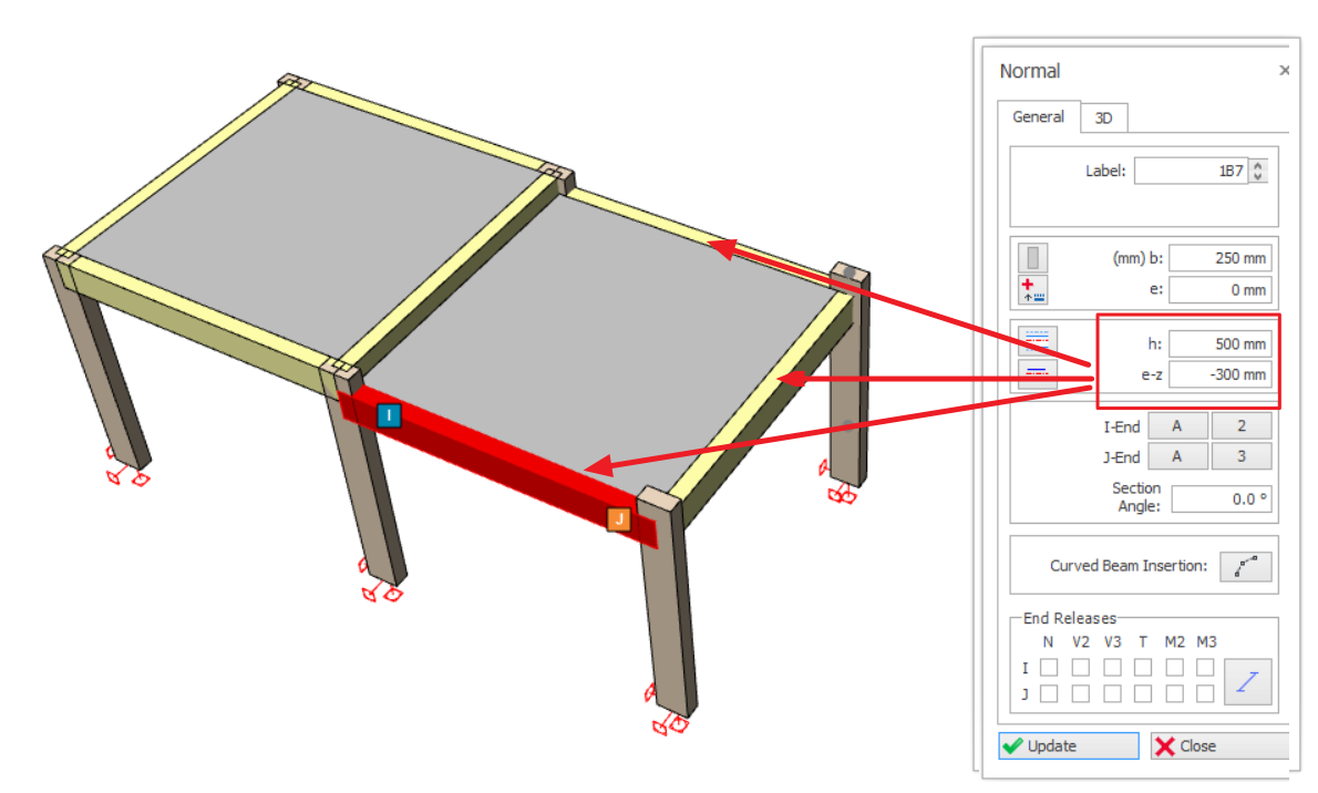 In the example model below, all the 3 beams in the right hand side are lowered (dropped) by 300mm.
