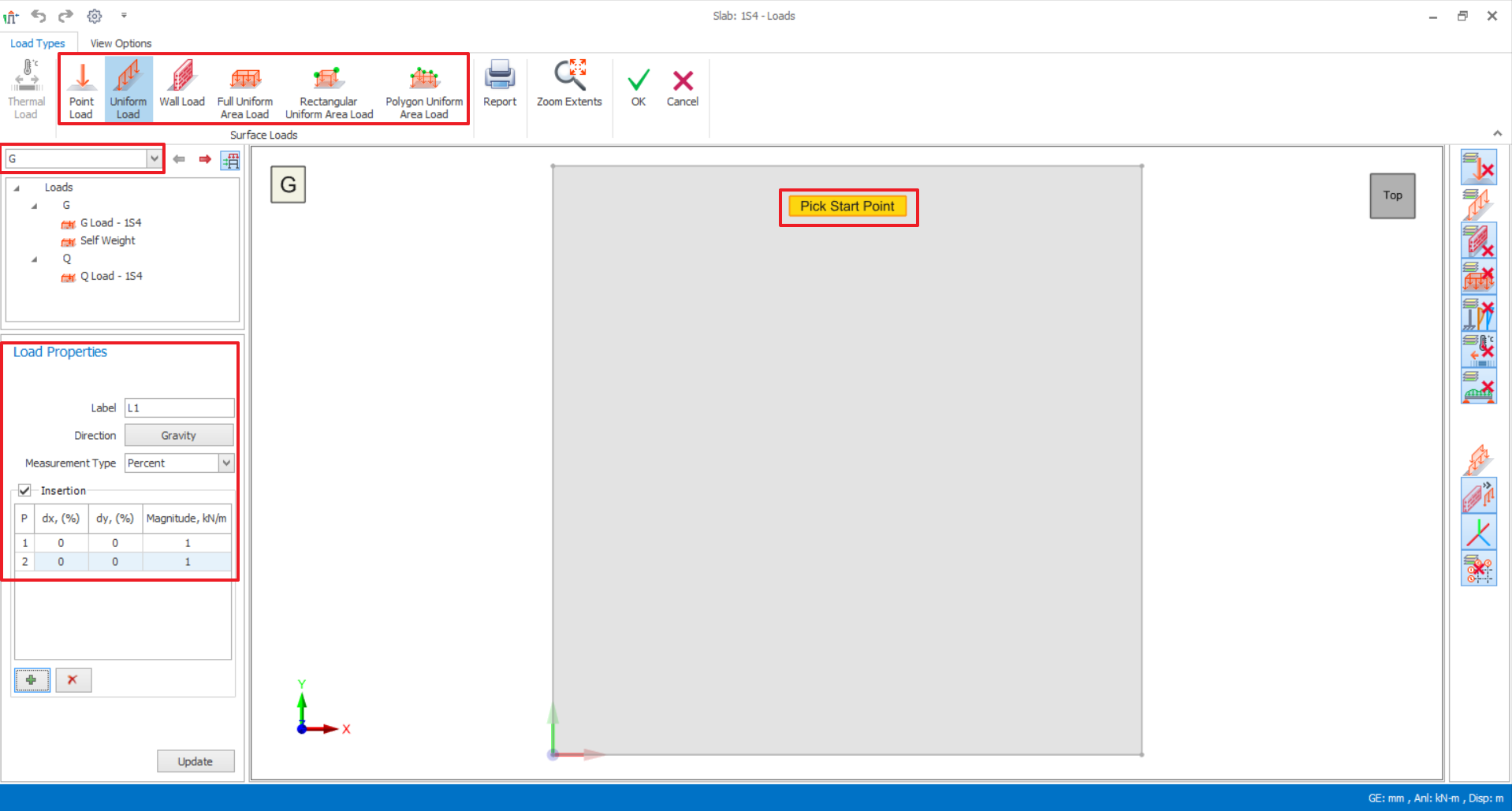 - Tick the option “Insertion”, revised or edit the load magnitude value and click on slab surface on to assign the load