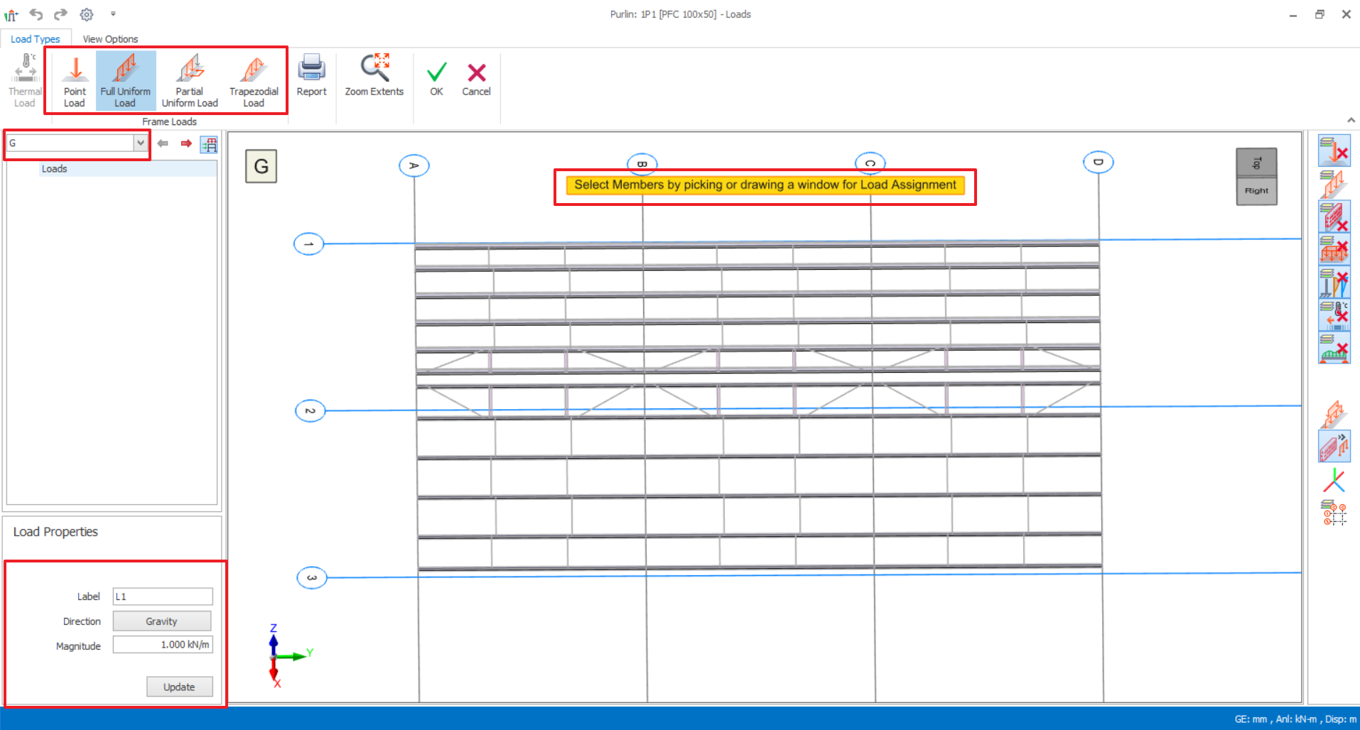 - Click on one purlin or more. If would like to assign corresponding loading more than one purlin, click and drag a window to assign.