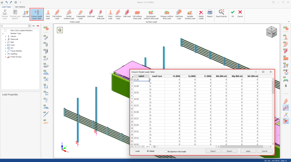 1. Go to the plan view of the storey where you want to insert the column loads.2. Open the Loading Editor Storey for the active floor.3. Click on the "Column Nodal Loads Table" button on the toolbar in the loading editor.