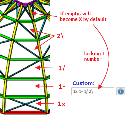 - Custom Longitudinal Fill Type Text : This only triggers on when "Longitudinal Fill Type" = "Custom". To set brace pattern manually by using text pattern :