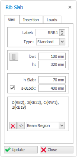 Width ("bw") and height ("h") of the rib beams, height of slab (or topping) ("h-Slab") and width of blocks (or clear distance between the ribs) ("s-Block") can be defined using these fields.