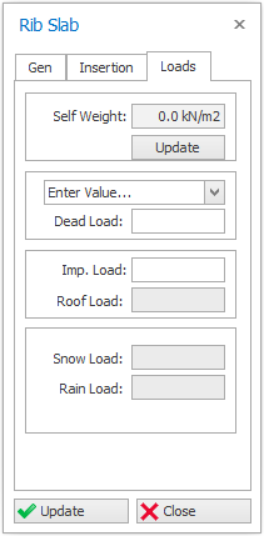 The "Ribbed Slab Properties" form has three tab pages named “General”, “Insertion”, and Loads.  You can shift between the pages by pressing the related tab heading.
