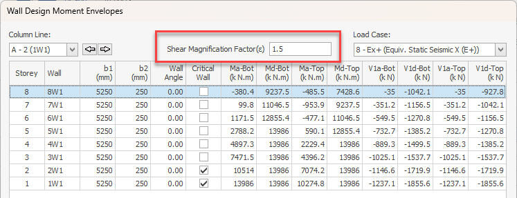 ProtaStructure provides a user-defined parameter for shear amplification factor which can be edited for each wall line. The default and the minimum value is 1.5 and the maximum value is the ‘q’ factor used in the analysis in the wall direction. ProtaStructure will magnify the analysis shear forces are by this factor inside the critical height. The shear diagram is linearly connected to the value at the top, which is Vwall,base/2.