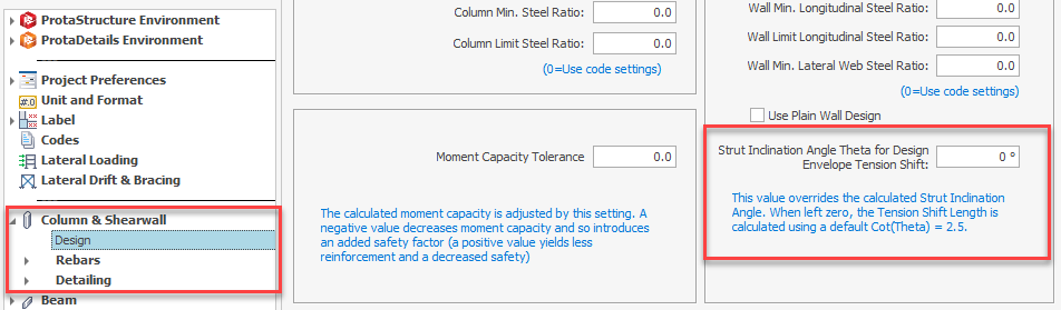 The value of strut inclination angle varies from 21.8 to 45 degrees. To leave room for individual interpretation, we have introduced a new setting, “Strut Inclination Angle for Design Envelope Tension Shift”. It is accessible from Settings > Column & Shearwall > Design.