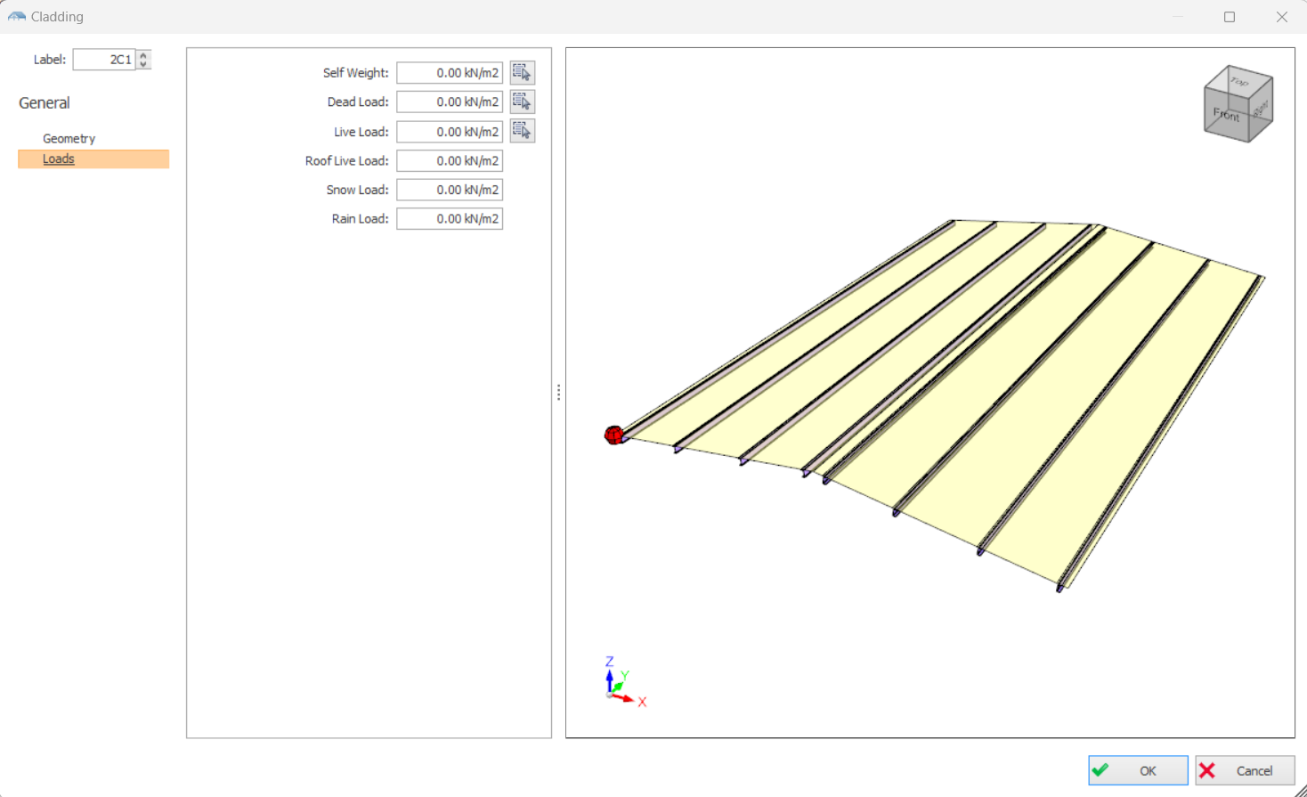 In this dialog, you can assign loadings on claddings, such as wind loads, dead loads, live loads, etc by using Edit Loads.