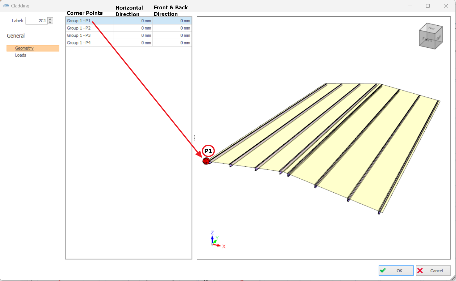 For example, enter -800mm in horizontal direction of P1 to extend the cladding by 800mm to the left and -800mm in the front direction to extend the cladding to the front by 800mm.