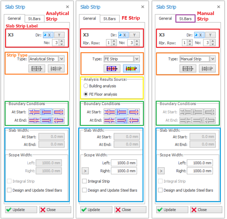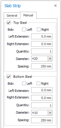 - Manual Strip : Manually assign slab rebars without analysis and design.Extra tab "St. Bars" can be found to fill in and display the steel bars associated with this strip.