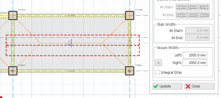 To easily define the scope width, the ">" button can be used to auto calculate the width of each side by clicking on to the point where you wish to extent the strip width within the slab.