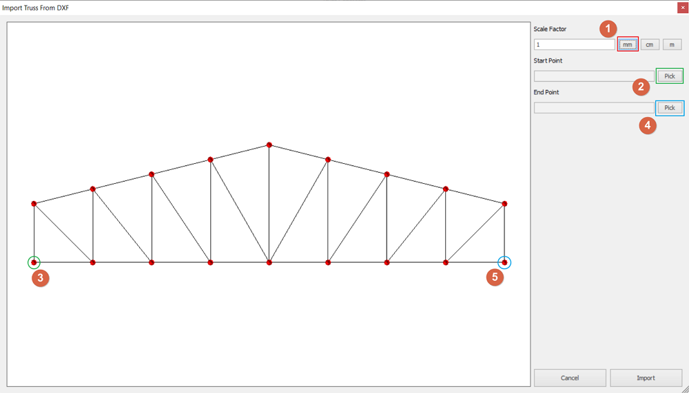 4. Adjust the scale factor, dimension units of the drawing, start point and end point of the truss. Select "Import" after configuration.
