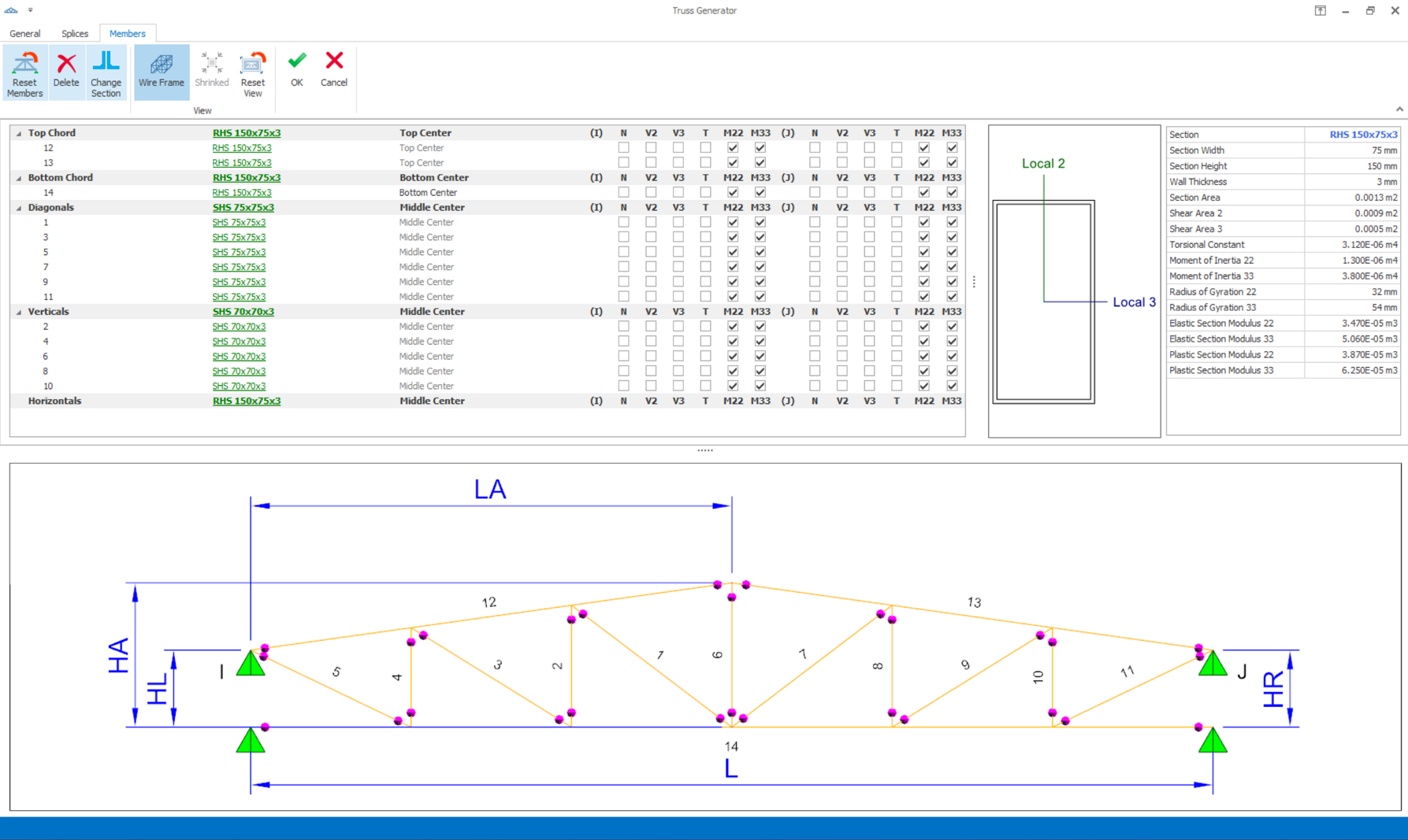 Truss members are grouped as "top chord", "bottom chord", "diagonal" and "verticals". Members sections can be changed multi or individually.